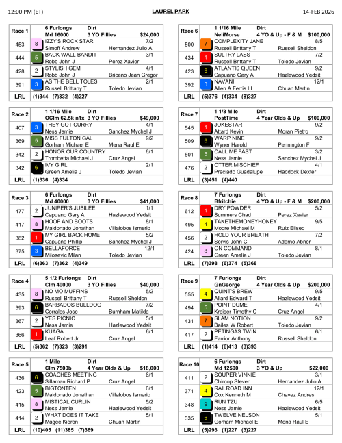 Aqueduct, Gulfstream, Fair Grounds, Oaklawn, Santa Anita, and Turfway